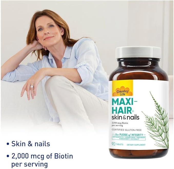 Country Life Maxi-Hair Supplement - 2000mcg Biotin & Vitamins for Hair, Skin & Nails - Certified Gluten-Free & Vegetarian - Supports Hair Growth, 90 Tablets