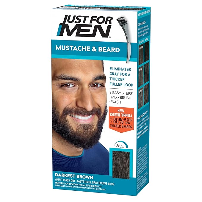 - Just For Men Mustache & Beard, darkest brown (M-50), is beard coloring that makes getting rid of gray facial hair easy. Unlike other dyes, it restores your natural beard color, thicker and fuller look