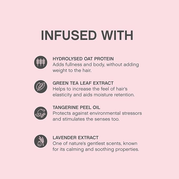 - Nourishing Shampoo: This hair shampoo is formulated with Hydrolysed Oat Protein for body, Green Tea Extract for elasticity, and Tangerine Oil for intense shine
