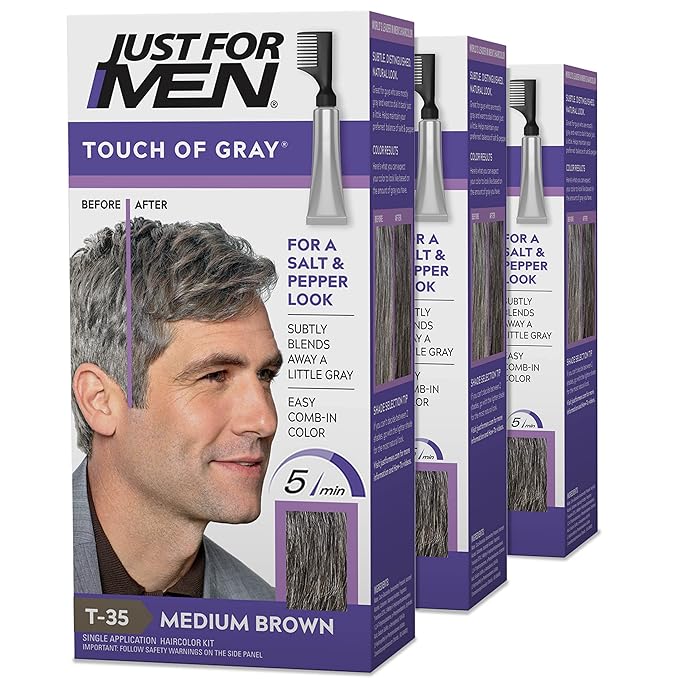 Just For Men Touch of Gray, Mens Hair Color Kit with Comb Applicator for Easy Application, Great for a Salt and Pepper Look - Medium Brown, T-35, Pack of 3