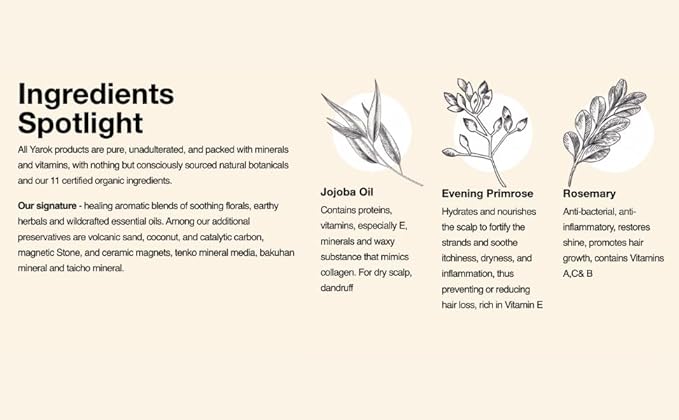 - NATURAL INGREDIENTS - Everything you’ll love, nothing you won’t. Yarok hair products are packed with nourishing ingredients like Jojoba Oil, Primrose and Rosemary. Our Feed Your Ends Leave In Conditioner is rich in vitamins and is formulated to help achieve smooth, tangle-free hair.