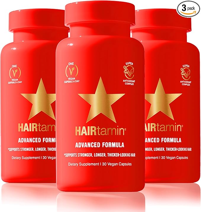 HAIRtamin Advanced Formula Hair Growth Supplement for Women & Men, Supports Stronger, Longer, Visibly Thicker Hair, With 5000 mcg Biotin, Vitamins & Antioxidants, 100% Vegan – 3 Month Supply