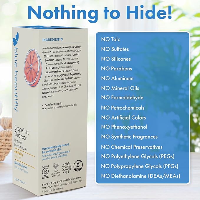 Blue Beautifly Grapefruit Deep Pore Cleanser - Removes Dirt, Pollutants, & Makeup - No Sulfates, SLS, PEGs, Toxins, Synthetics - Plant-based, Hypoallergenic, Dermatologically Tested - 4 fl oz