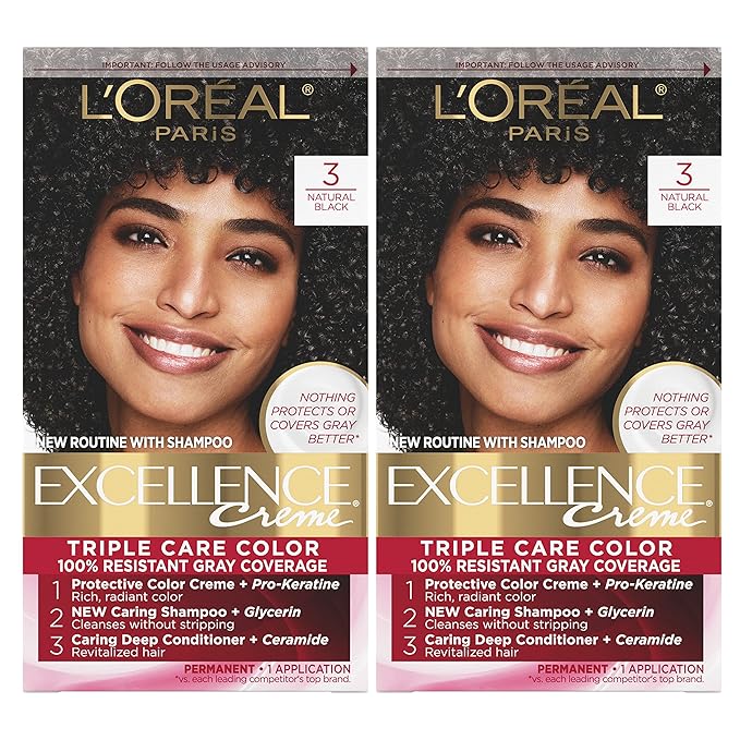 L'Oreal Paris Excellence Creme Permanent Hair Color, 3 Natural Black, 100 percent Gray Coverage Hair Dye, Pack of 2