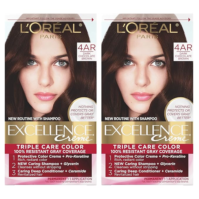 L'Oreal Paris Excellence Creme Permanent Hair Color, 4AR Dark Chocolate Brown, 100 percent Gray Coverage Hair Dye, Pack of 2