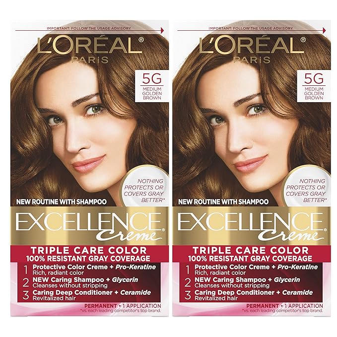 L'Oreal Paris Excellence Creme Permanent Hair Color, 5G Medium Golden Brown, 100 percent Gray Coverage Hair Dye, Pack of 2