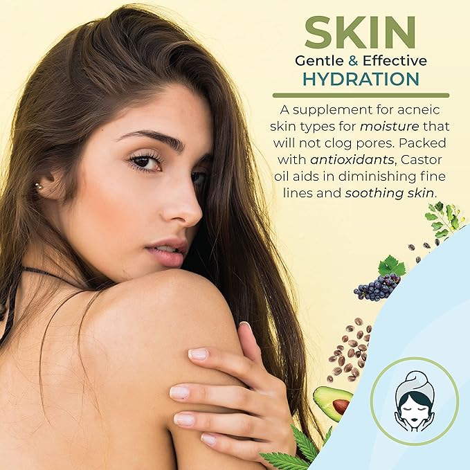 - FOR SKIN: Gentle and effective for skin hydration, castor oil is a wonderful supplement for acneic skin types for moisture that will not clog pores. Packed with antioxidants, it can also aid in diminishing fine lines and fighting free radicals.