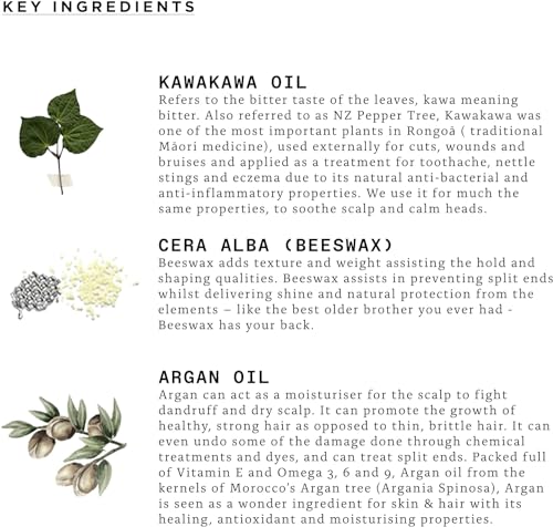 - Natural, Sustainable Ingredients | Water-based fibre paste expertly blended with Beeswax, nourishing Argan Oil, and soothing Kawakawa extract. Provides thickening, texture, and flexible hold suitable for all hair types and styles.
