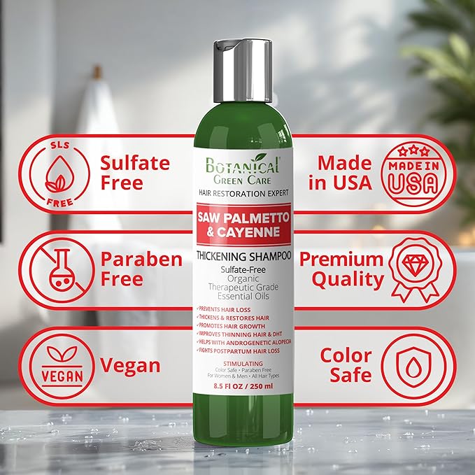 - FOR THINNING HAIR: Botanical Green Care Shampoo promotes hair strength & thickness. Our “Science + Nature” formula is a combination of the natural botanical plant-based ingredients, including Saw Palmetto, Biotin, Niacin, Caffeine, Apple, Argan & Grape Stem Cells.