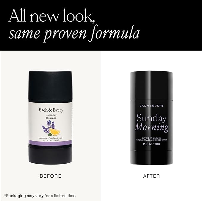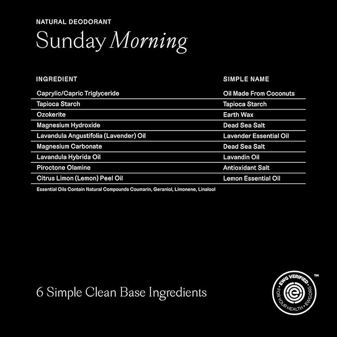 - Sunday Morning - This scent carries calming notes of floral, herbal lavender and bright, freshly peeled lemons. Meanwhile, plush tapioca starch and conditioning coconut oil also give this sensitive skin deodorant a smooth glide.