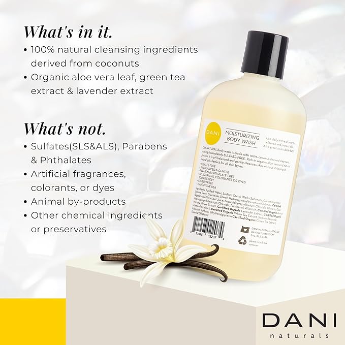 - ● Gentle & Suitable for All Skin Types: DANI Naturals Body Wash is carefully crafted with a pH-balanced formula and coconut-derived cleansers that gently cleanse the skin without stripping away its natural moisture. Ideal for all skin types, including dry and sensitive skin, it provides a soothing, irritation-free shower experience.