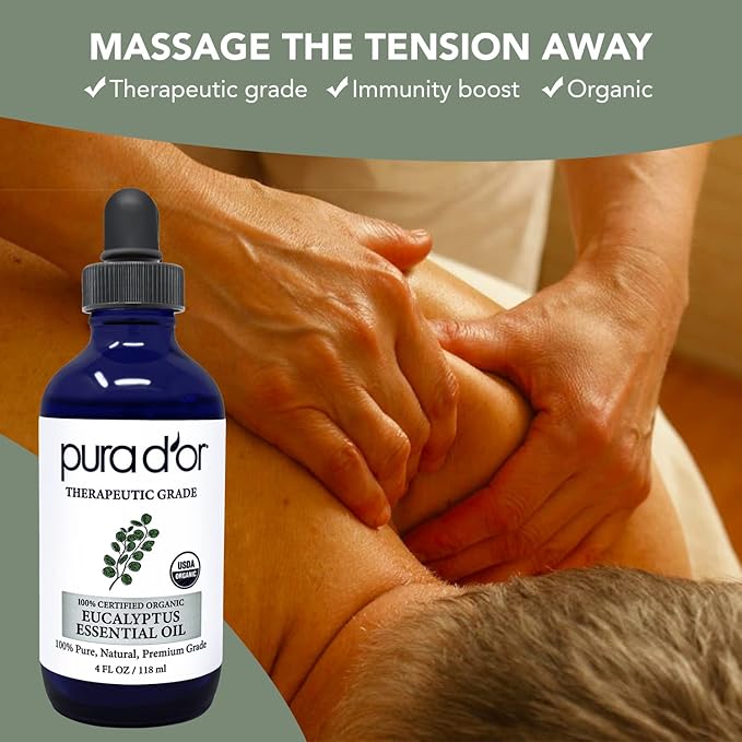 PURA D'OR Organic Eucalyptus Essential Oil (4oz with Glass Dropper) 100% Pure & Natural Therapeutic Grade for Hair, Body, Skin, Aromatherapy Diffuser, Relaxation, Massage, Home, DIY Soap
