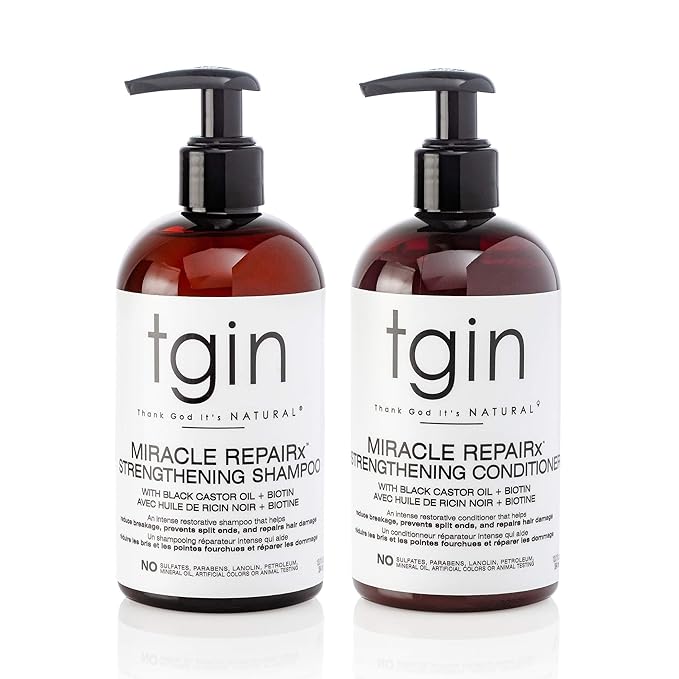 tgin Miracle RepaiRx Strengthening Shampoo and Conditioner Duo for Curly, Coily and Wavy Hair, with Biotin and Black Castor Oil, Repairs and Restores Damaged, Color-Treated Hair, 13 oz (Set)