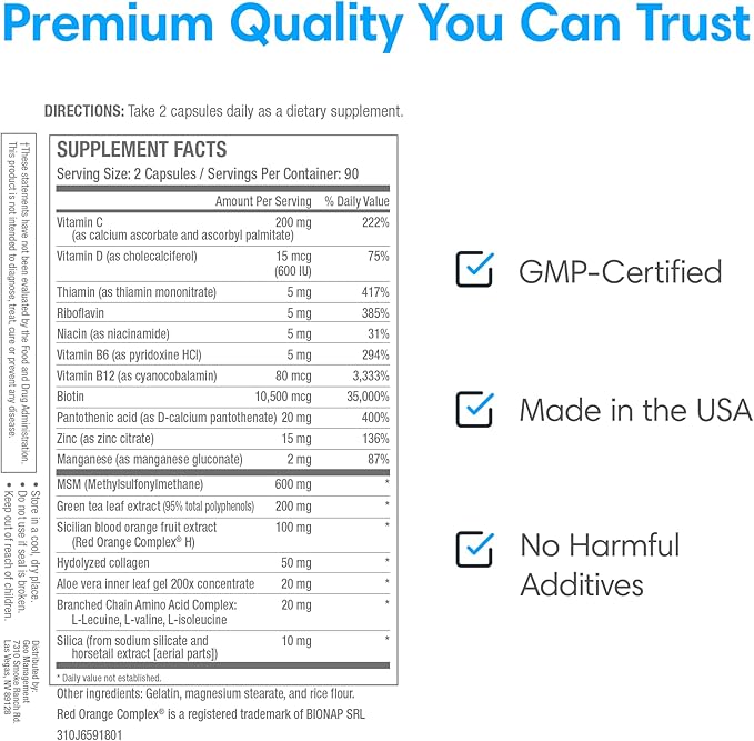 - Special Ingredients : Biotin, Collagen, Green Tea Leaf Extract, Methylsulfonylmethane, Sicillian Blood Orange Fruit Extract Biotin, Collagen, Green Tea Leaf Extract, Methylsulfonylmethane, Sicillian Blood Orange Fruit Extract