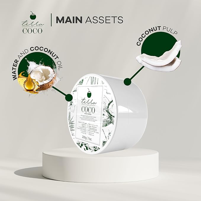- NATURAL & VEGAN INGREDIENTS. Its main assets are Green Coconut Pulp which high-fat content helps to restore damaged, dry, or burned hair by the sun/chemicals; Coconut Water, which contains a large selection of properties, among which the moisturizing and antioxidant stand out. Rich in vitamin B, sodium, and potassium, 3 essential nutrients that maintain a radiant appearance; and 100% vegetable coconut oil, known for its moisturizing and nourishing properties that can also help fight dandruff.