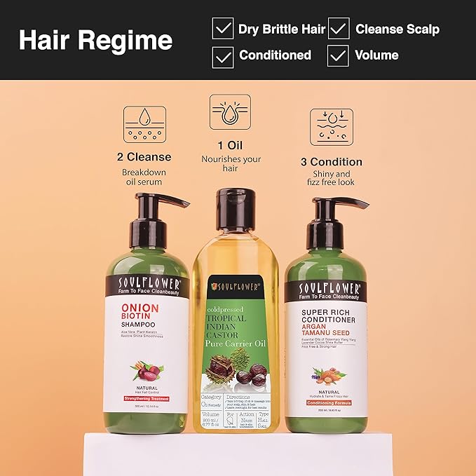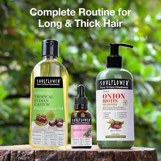 - REGIME: Mix 5 drops of any Soulflower Essential Oil with 1 tbsp of Castor Oil & apply for additional benefits. Keep it for a minimum of 30 minutes or overnight and wash it off with Soulflower Onion Biotin Shampoo.