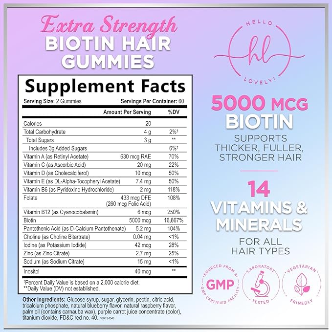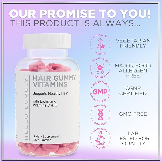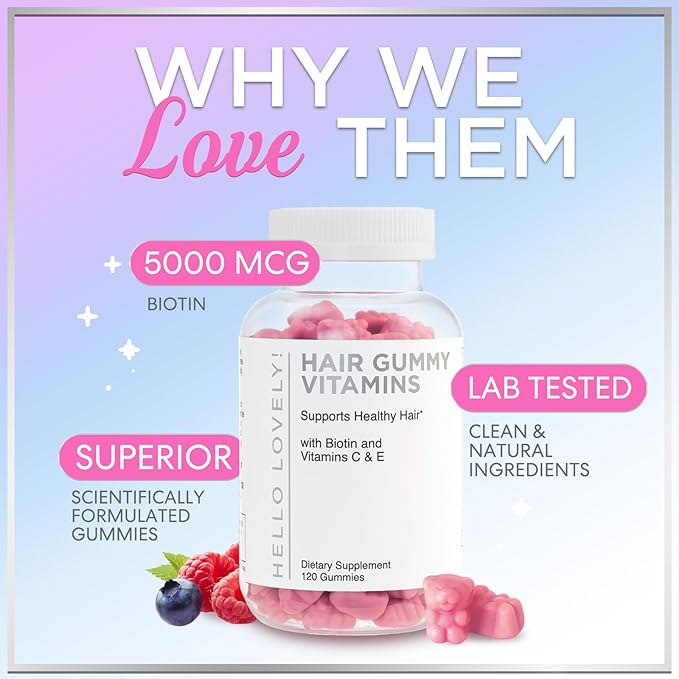 - HAIR GUMMY VITAMINS: Hello Lovely! Hair Vitamins Gummies pack 5000 mcg of Biotin, plus Vitamins E & C and zinc, to support luscious hair growth
