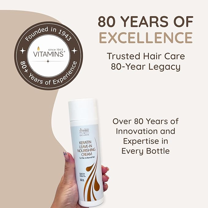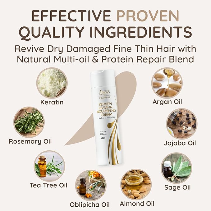VITAMINS hair cosmetics Keratin Leave In Conditioner for Thin Hair - Lightweight Moisturizer & Hydrating Detangler Cream for Dry Damaged Hair - Frizz Control & Sulfate Free - 8.5 Fl Oz