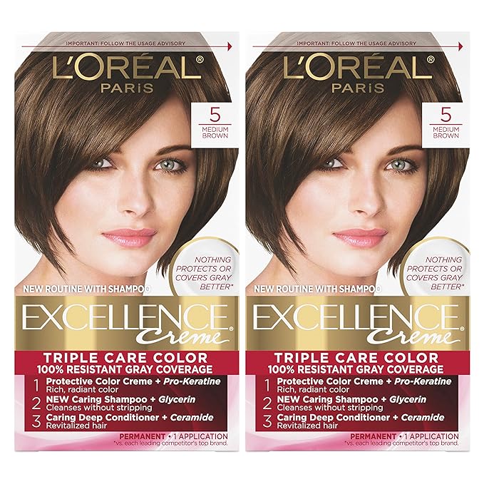 L'Oreal Paris Excellence Creme Permanent Hair Color, 5 Medium Brown, 100 percent Gray Coverage Hair Dye, Pack of 2