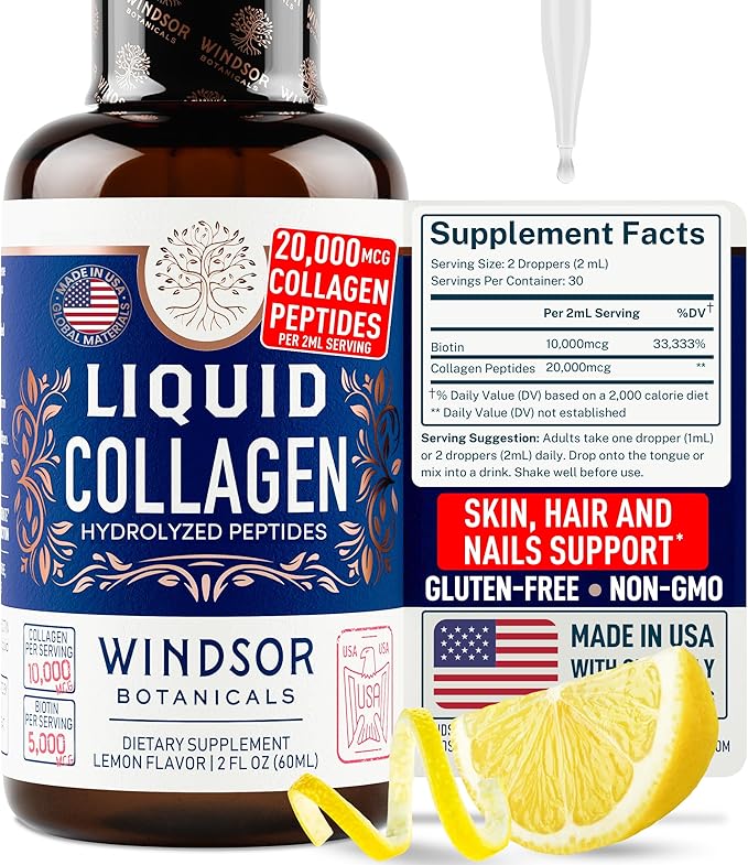Concentrated Liquid Collagen Peptides Supplement - Hair, Skin, Nail, Joints Support - Sublingual Drops by WINDSOR BOTANICALS - 10,000mcg Collagen, 5,000mcg Biotin - Lemon Flavor - 2-Month - 2 oz