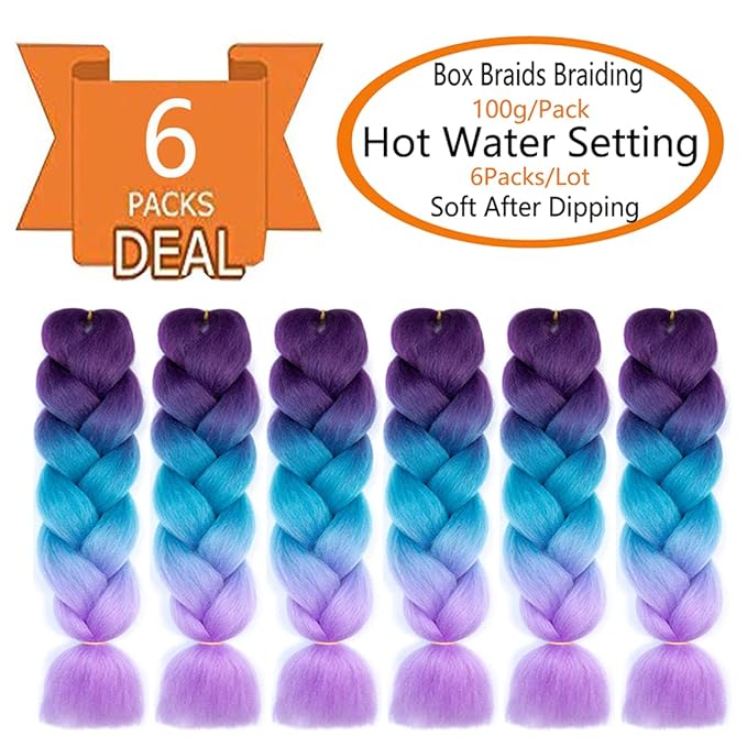 6 Packs Ombre Jumbo Braiding Hair Extensions 24 Inch High Temperature Synthetic Fiber Hair Extensions for Box Braids Braiding Hair (Purple to Lake Blue to Light Purple)