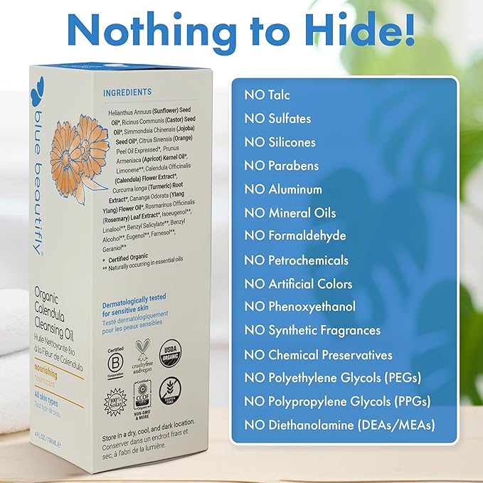 Blue Beautifly USDA Certified Organic Calendula Cleansing Oil - Removes Makeup, Cleanses Pores, and Restores Protective Barrier - Enriched with Apricot Oil and Turmeric Extract - 4 fl oz