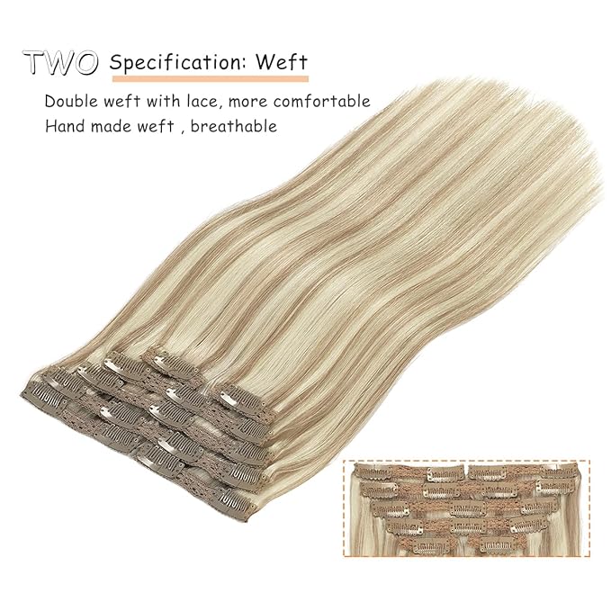 - ♛【Hair Extensions Specification】: Fashionable Color P10-613 Highlight Golden Brown and Bleach Blonde Clip in Hair Extensions Human Hair; 7Pcs/Package; Hair Weight: 120g/Pack,14-18inch Available. 140g/Pack,20-22inch Available. Blend with Your Hair Color Prefect!