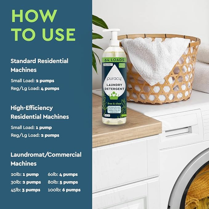 - Lasting Laundry Care - Puracy liquid laundry detergent gives you the kind of care you and your family deserve. With a handy 16 oz of laundry concentrate, this pump bottle offers up to 64 loads, enough to clean thoroughly without waste.
