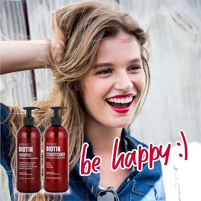 - ALL NATURAL SHAMPOO AND CONDITIONER – Mosaic Biotin restorative and moisturizing shampoo and conditioner set is infused with 100% Moroccan Argan Oil, Tea Tree Oil, Shea Butter, Keratin, Ginseng, Turmeric Extract, and Biotin (Vitamin H).