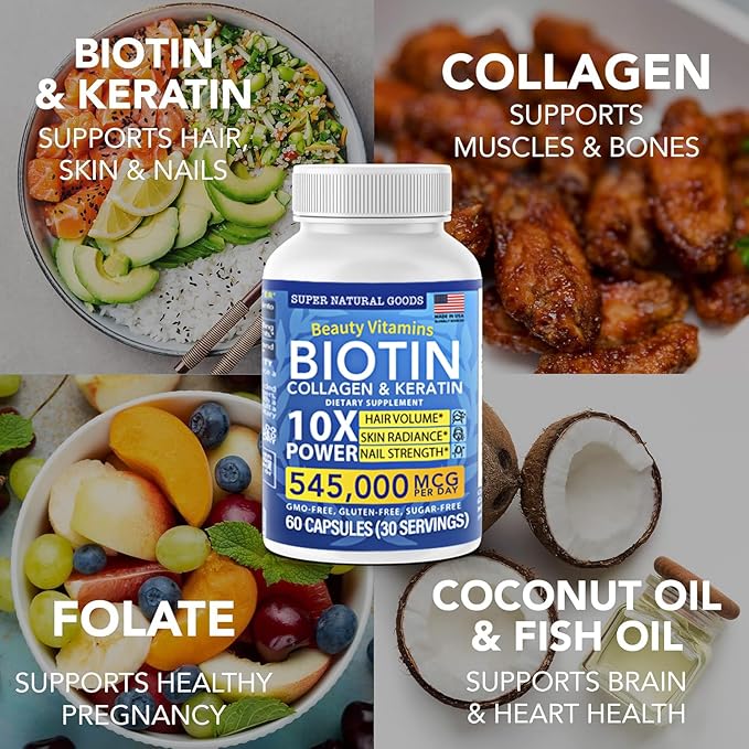 - Beauty Essential – With more than 500,000mcg you'll be supplementing the biotin collagen and keratin required to support the building blocks to strong bones, muscles, skin tissue, teeth and hair! Keratin is part of organs, blood vessels as well as other parts of the body. It's sort of the glue that holds things together. Boost beauty efforts with this effective daily vitamin!