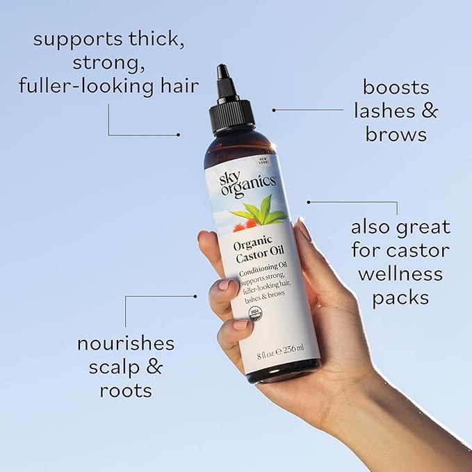 Sky Organics Castor Oil - USDA Certified Organic Hair Oil for Hair Growth, Skin, Face, Eyelashes - Cold Pressed & Hexane Free - Pure Organic Castor Oil Pack Wrap - Carrier & Hair Treatment Oil