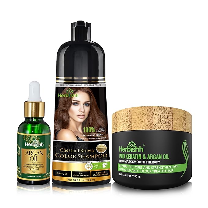 Herbishh After Color Shampoo Combo Contains Hair Color Shampoo Hair Dye 500ml Argan Oil Pro Keratin And Argan Hair Mask For Hair Straightening, Shine and Protection For Men And Women (Chestnut Brown)