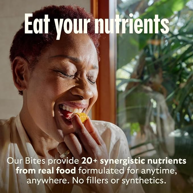 - MORE THAN A MULTIVITAMIN: One delicious, real-food Bite packed with 20+ essential nutrients, whole food vitamins, minerals, and superfoods to help fill daily gaps — no pills, capsules, or synthetic nutrients. This is a great supplement to boost energy, gut health, skin, promote healthy hair growth, natural GLP-1 for weight management, brain and bone strength, and immunity!