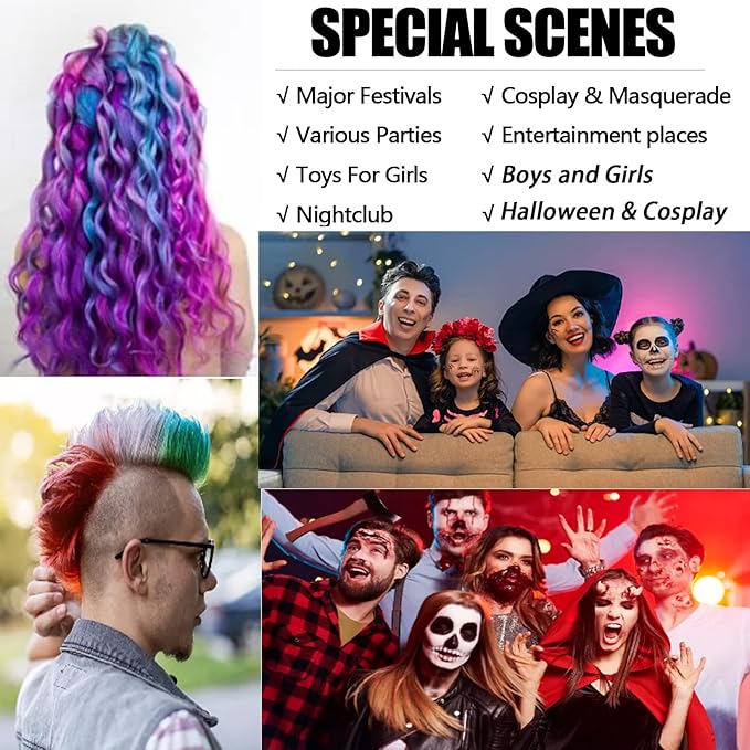 - 1.Easy use and clean Temporay Hair Color, Long lasting ,Refreshing fragrance and portable,Perfect for Daily use, Festivals, Parties, Stag & Hen, Events, Clubbing, Raves, Halloween, Fancy dress.