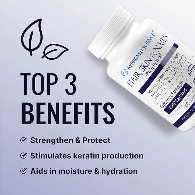 - Three in One - Approved Science has created a unique formula to provide a daily serving of vitamins, minerals, and nutrients for hair, skin, and nails.