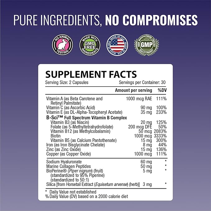 Approved Science Hair, Skin and Nails - Support Supplement - Biotin, Collagen, Vitamin B Complex, Silica, BioPerine - 60 Capsules - 1 Month Supply