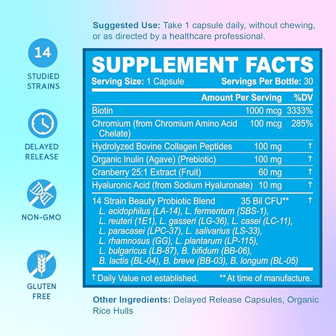 - Powerful Immune System & Beauty Supplement: 35 Billion CFUs, 14 clinically studied & patented Lactobacillus and Bifido strains made in the USA, and 6 hair skin and nails vitamins in this one-a-day womens probiotics. This doctor formulated daily probiotic for women is the only one with ingredients to target both probiotic and beauty health needs by supporting digestive health, yeast balance, vaginal health, gut health, healthy skin, and hair growth.*