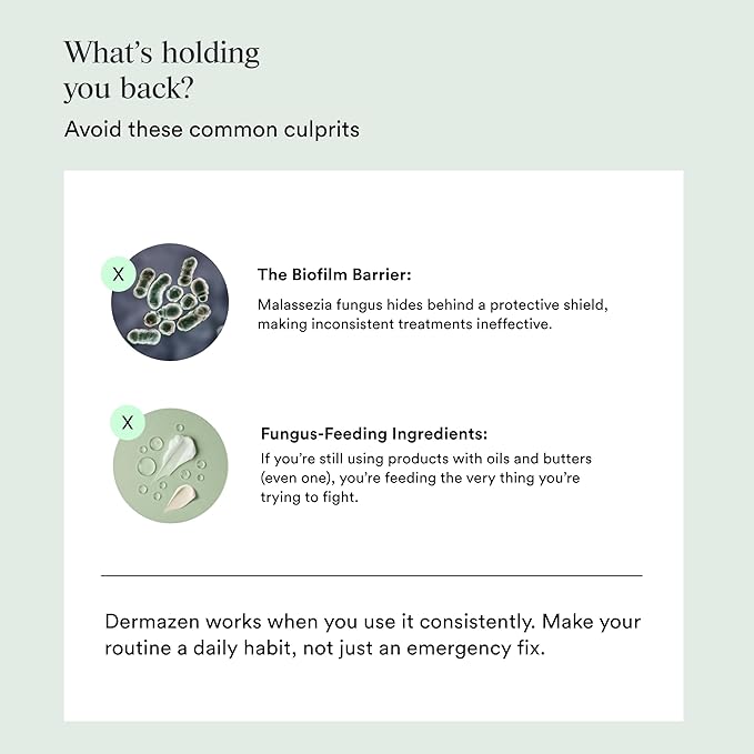 - Dermazen is three products in one. Learn how it works in 3 steps: 1. Disrupt the Biofilm - Our unique formula safely disrupts this outer layer, exposing the fungus to treatment. 2. Clear Away the Fungus - Once the biofilm is gone, you'll want to get rid of the fungus itself with our formula. 3. Soothe without Oils - Calm irritation and hydrate your skin without fungus-feeding oils (like coconut oil).