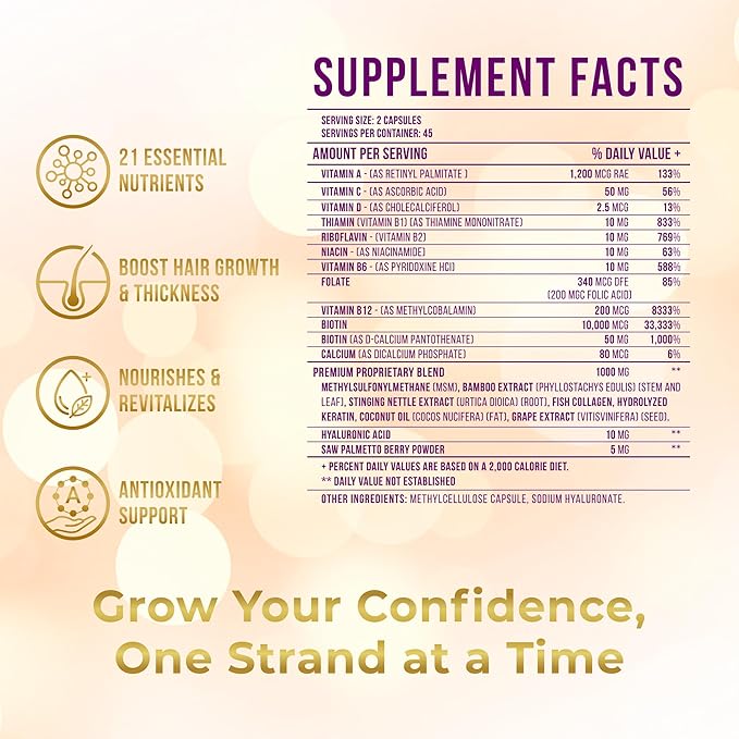 - MULTI-BENEFIT SUPPORT FOR SKIN & NAILS Formulated to nourish more than just hair — this advanced blend promotes glowing skin and stronger, healthier nails with every dose.