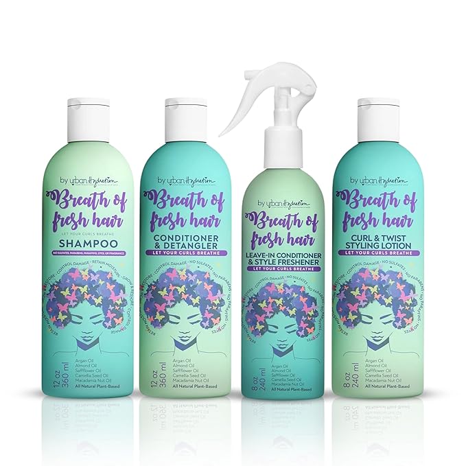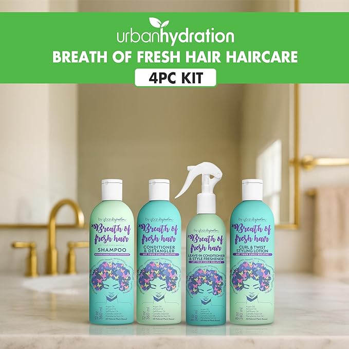 - ABOUT THE PRODUCT: Urban Hydration Breath of Fresh Hair Haircare 4pc Kit is all natural and safe for all hair types. The shampoo cleanses while moisturizing and preventing breakage to promote hair growth . The style lotion is the perfect aid to help keep your styles looking their best. The conditioner soothes and conditions the scalp and strands. The leave-in conditoner helps hydrate and refresh hair between washes and gentle enough for daily use. Contains (2) 12 Ounce and (2) 8 Ounce Bottles