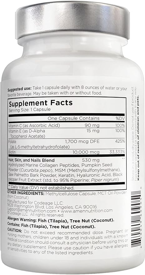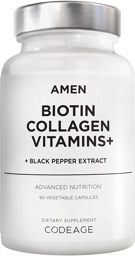 - Powerful Nutrient Combination: Amen Biotin Collagen Vitamins+ features 10,000 mcg of biotin, hydrolyzed collagen peptides, Vitamin C, Vitamin E, and folate—all in one convenient capsule.