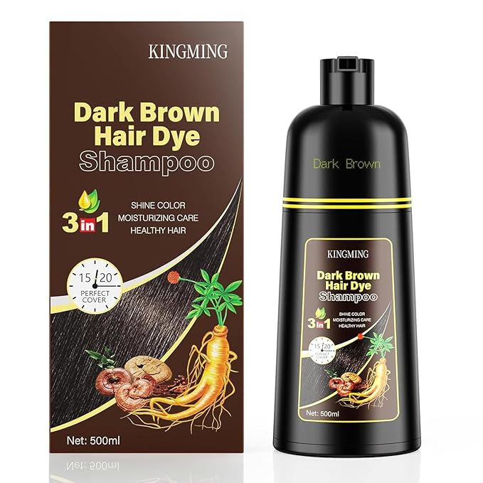 KINGMING Dark Brown 3 in 1 Hair Dye Shampoo for Gray Coverage, Herbal Ingredients for Men and Women, 500ml (Dark Brown)