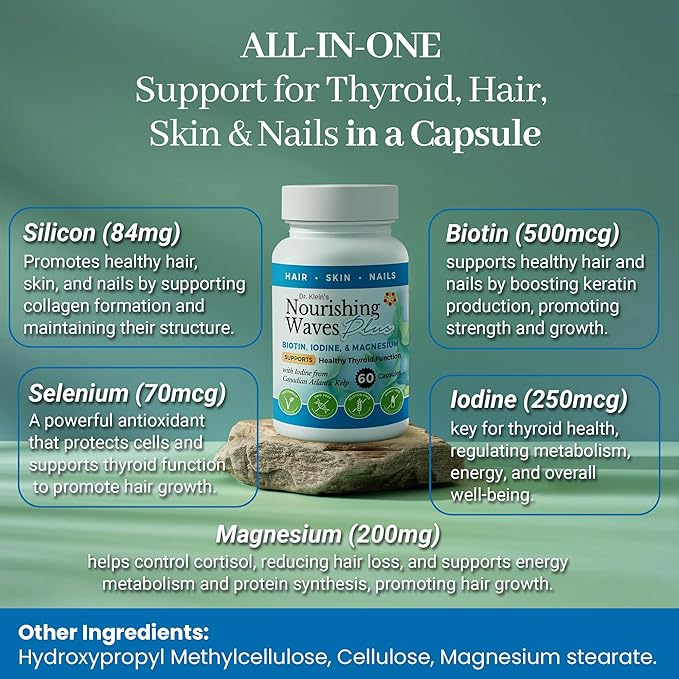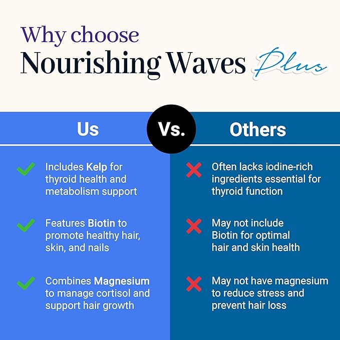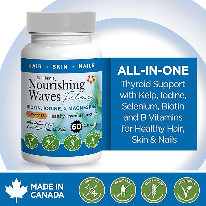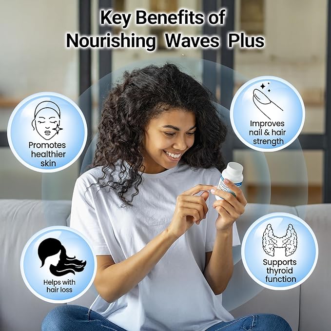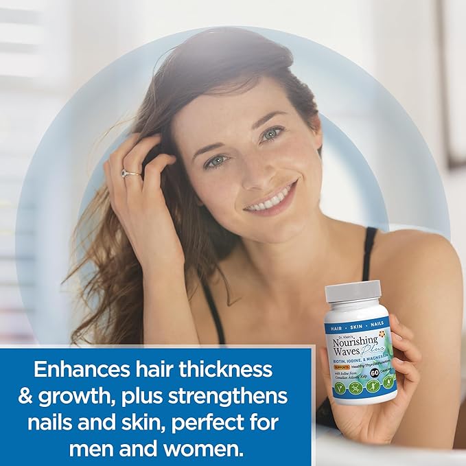 - THYROID FUNCTION SUPPORT: Nourishing Waves Plus includes biotin, Vitamins B1, B3, B6, and Canadian Atlantic Kelp, providing iodine and selenium essential for thyroid health. This complete formula promotes strong, healthy hair and balanced metabolism, increasing energy levels and overall wellness.