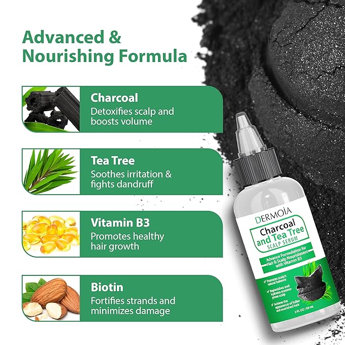 - NOURISHING CHARCOAL & TEA TREE SCALP SERUM - DERMOIA hair moisturizer & dry scalp serum takes a skincare approach to the scalp, promoting healthy, nourished hair & scalp’s natural balance. This scalp moisturizer for dry scalp is formulated with Activated Charcoal & Tea Tree Oil, which help draw out impurities, excess oil, & dead skin cells, supporting scalp health & hair growth.