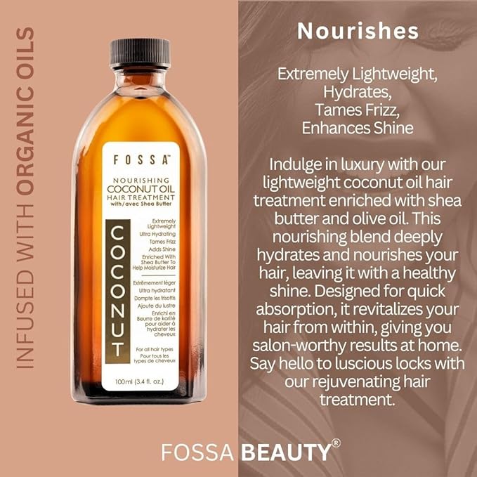 - HAIR REPAIR FOR ALL TYPES: Fossa's Nourishing Coconut Oil Hair Treatment with Shea Butter provides a hair gloss treatment for all hair types. The coconut oil can restore hair's shine and softness while helping to reduce breakage and prevent split ends. The keratin oil helps protect from frizz as it prevents split ends and reduces breakage of the hair shaft. Combined, the infusion of the oil and butter can help every hair type have manageable and smooth looking hair.