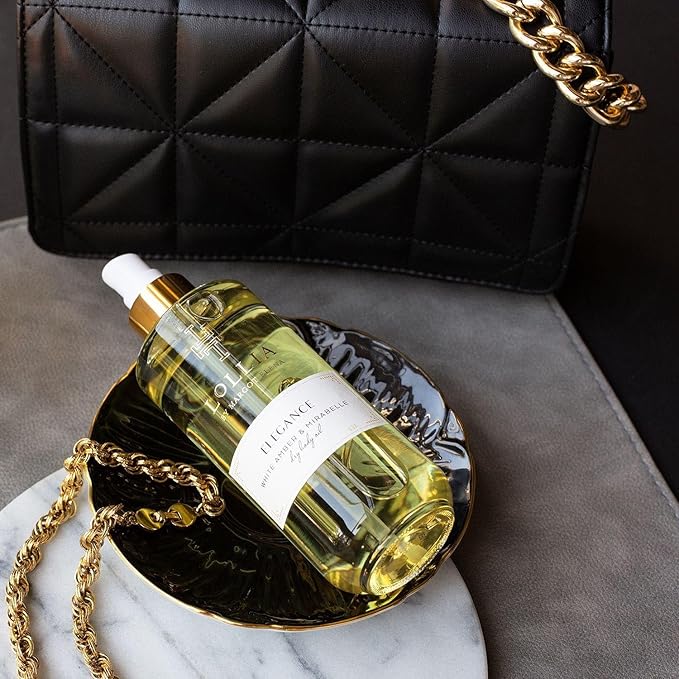 - DRY BODY OIL FOR WOMEN: Lush and gentle, Lollia Elegance Dry Body Oil is a moisture-rich pick-me-up. The body oil spray is delightfully fragranced with White Amber and Mirabelle.
