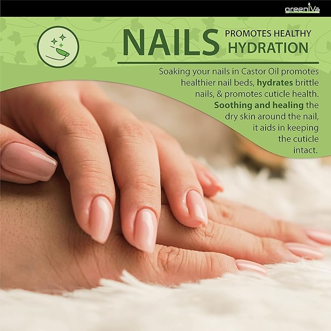 - HAIR: Rich in Vitamins and Fatty Acids GreenIVe Castor Oil is excellent for Hair. Assisting in growth and strength of hair. Simply massage into the roots and work your way outward. Can also be used on eyelashes