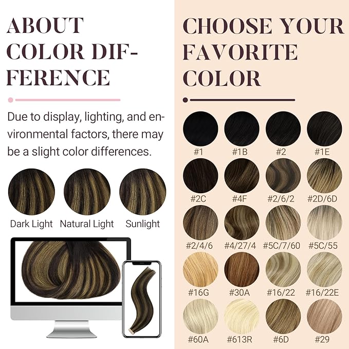 - Tape in Hair Extensions Quality: 100% remy human hair extensions, salon quality, thick & full ends, no split, no tangles, no shedding, soft and smooth,lightweight, ensuring maximum comfort throughout the day and allowing for a natural and seamless look, can perfectly blend with your own hair. It can be washed, straighten, curled, etc