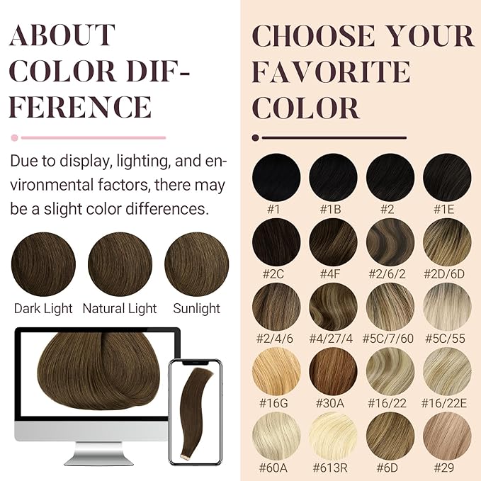 - Tape in Hair Extensions Quality: 100% remy human hair extensions, salon quality, thick & full ends, no split, no tangles, no shedding, soft and smooth,lightweight, ensuring maximum comfort throughout the day and allowing for a natural and seamless look, can perfectly blend with your own hair. It can be washed, straighten, curled, etc
