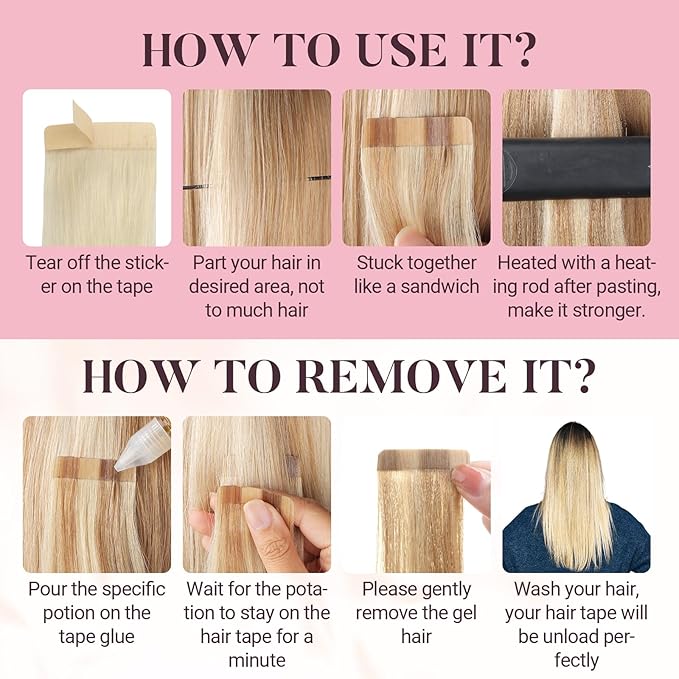 - Ultra invisible tape in hair extensions: Adhesive double-sided tape has been upgraded with the latest ultra-thin glue, can make your scalp and tape fit better. Hair tape will last very long when worn after being heated, can be removed with cleaning fluid, no harm to your scalp